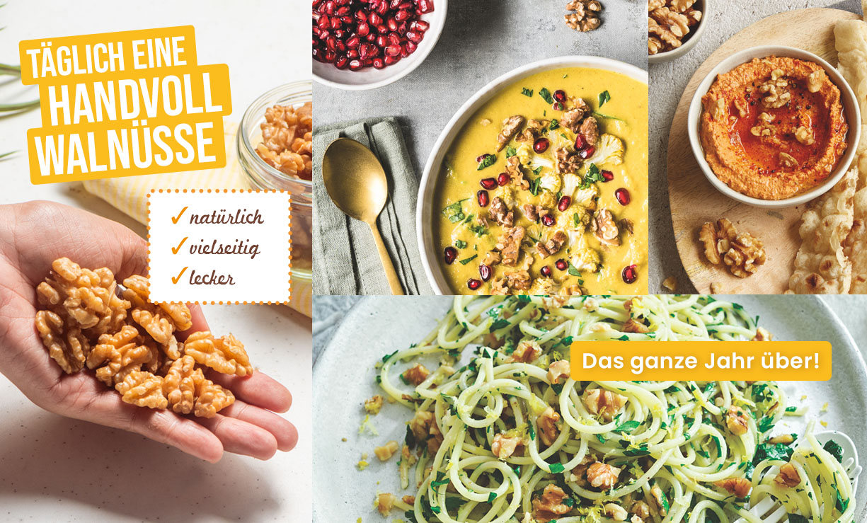 Durch ihren angenehm milden Geschmack sind kalifornische Walnüsse vielseitig und kinderleicht einsetzbar und eignen sich sowohl für süße als auch salzig-herzhafte Rezeptideen.
